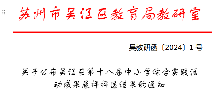 近日,吴江区第十八届中小学综合实践活动成果展评评选结果揭晓,绸都小学编撰的综合实践成果集《吴风绸韵》喜获综合实践活动成果集二等奖,钱俊杰老师和陈肖依老师指导的《丝绸探秘》喜获综合实践活动成果展评二等奖。