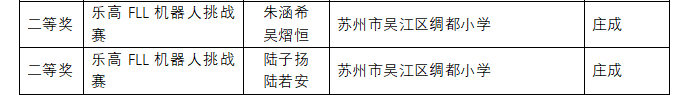 2024年吴江区中小学生信息素养提升实践活动圆满落幕。由庄成老师领队的朱涵希和吴熠恒、陆子扬和陆若安组成队伍在乐高FLL机器人挑战赛中获得二等奖庄成老师荣获2024年吴江区中小学生信息素养提升实践活动优秀指导老师。