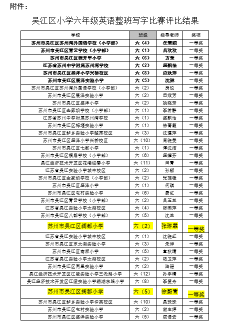 喜报:绸都小学学生参加吴江区小学六年级整班英语写字比赛获一等奖