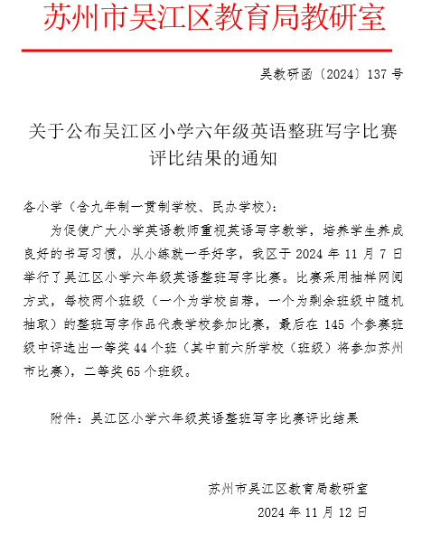 为促使广大小学英语教师重视英语写字教学,培养学生养成良好的书写习惯,从小练就一手好字,我区于2024年11月7日举行了吴江区小学六年级英语整班写字比赛。比赛采用抽样网阅方式,每校两个班级(一个为学校自荐,一个为剩余班级中随机抽取)的整班写字作品代表学校参加比赛,绸都小学六(2)班和六(5)班在比赛中脱颖而出,双双荣获一等奖,感谢指导教师张琳菲和徐蔚青老师的辛勤辅导。