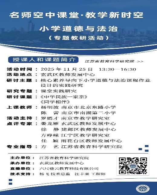 2025年11月25日13:30-16:30,由江苏省教育科学研究院主办、玄武区教师发展中心承办的“名师空中课堂·教学新时空”小学道德与法治专题教研活动,在玄武区教师发展中心顺利开展。