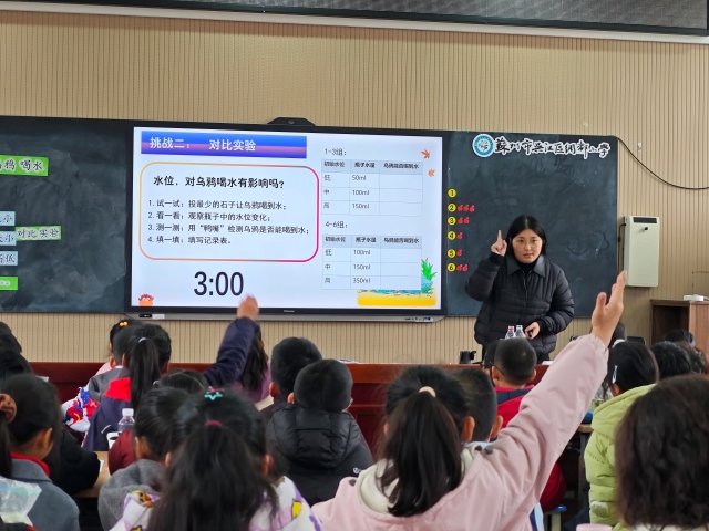 吴江区绸都小学的施正芳老师以《巧助乌鸦喝水》为主题,以学生们耳熟能详的《乌鸦喝水》的故事导入,了解神奇的毛细现象,引导学生通过对比实验、动手操作逐步深入探究如何运用新方法让乌鸦能喝到水,将故事从文本走向生活。