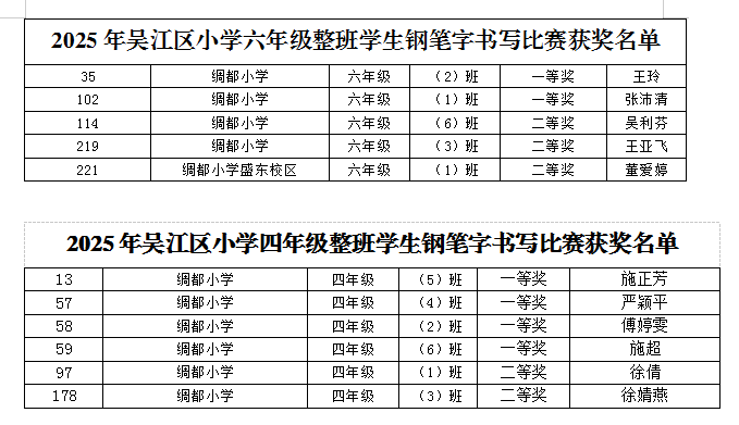 近日,苏州市吴江区教育局教研室公布了2025年区小学四、六年级整班学生钢笔字书写比赛结果,我校师生表现优异,荣获多个奖项。
